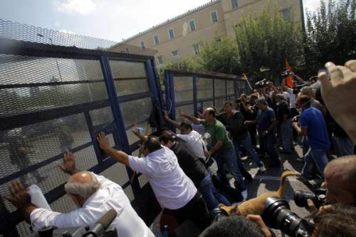 Από τα χθεσινά επεισόδια: Κουκουλοφόροι νεαροί... (οι γνωστοί "μπαχαλάκιδες" ) | προσπαθούν να γκρεμίσουν το φράχτη της αστυνομίας ! |